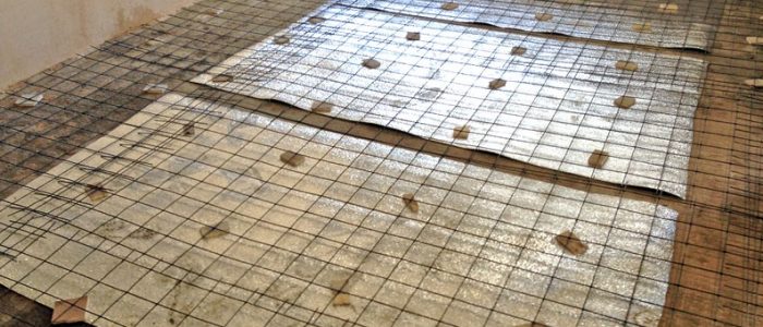 Армирующие материалы укладываются с нахлестом как минимум в 1 ячейку, так, чтобы они находились в толще стяжки.