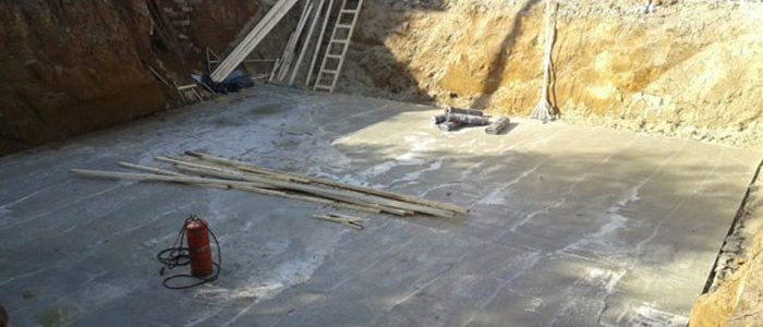 Перед монтажом котлована определяется уровень нахождения поверхностных вод на участке под застройкой. Это будет «отправной точкой» при сооружении подбетонки — она должна находиться выше. Выполняется рытье траншеи, дно которой потом трамбуется и выравнивается. Для придания конструкции улучшенных качеств дно засыпается тонким слоем песка и щебенки, которые разравниваются по котловану. Желательно выполнить пленочный или рулонный гидробарьер для защиты монолита. Осторожно в толщу основания устанавливают секции арматуры. Рекомендуется зафиксировать по уровню маяки, по ним будет легко контролировать укладку раствора. Далее выполняют заливку подготовленного бетона. После его созревания поверхность бетонной подготовки обрабатывают битумной мастикой.