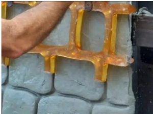 Процесс состоит в последовательном накладывании штампов на влажный искусственный камень, наступая на них для получения оттиска. Подошва в обуви трамбовщика должна быть чистой и не рифленой, иначе наличие мусора испортит текстуру желаемой поверхности. Нюанс заключается в правильности выбора времени для начала этого этапа.