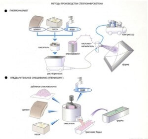 Виброформование – не является отдельным способом производства стеклофибробетона, скорее метод изготовления негабаритных изделий. Бетон, помещенный в формы, насыщают стекловолокном на стенде (установленная столешница на вибрирующем механизме). Волокно равномерно распределяется в бетонной массе, но метод подходит только при производстве небольших плит.